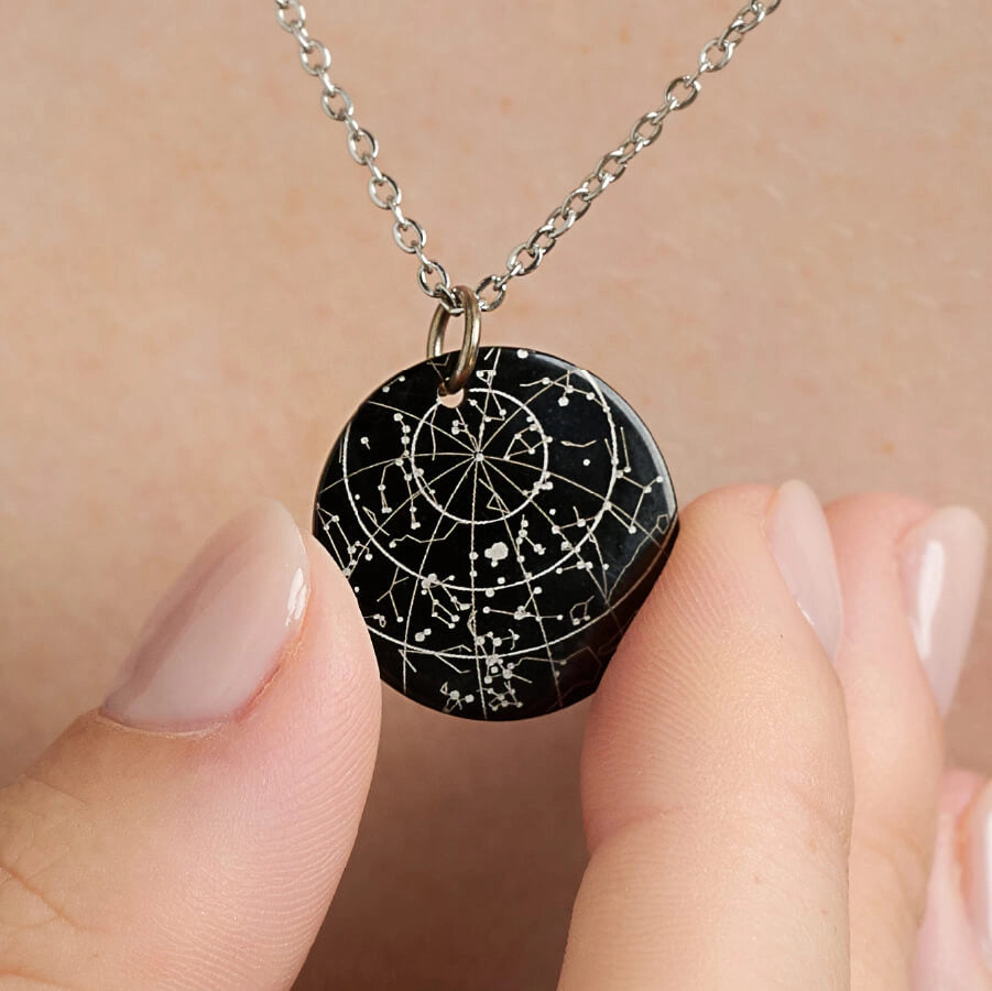 A sleek black steel pendant engraved with your personal star map. Bold, modern, and designed to keep your moment close.