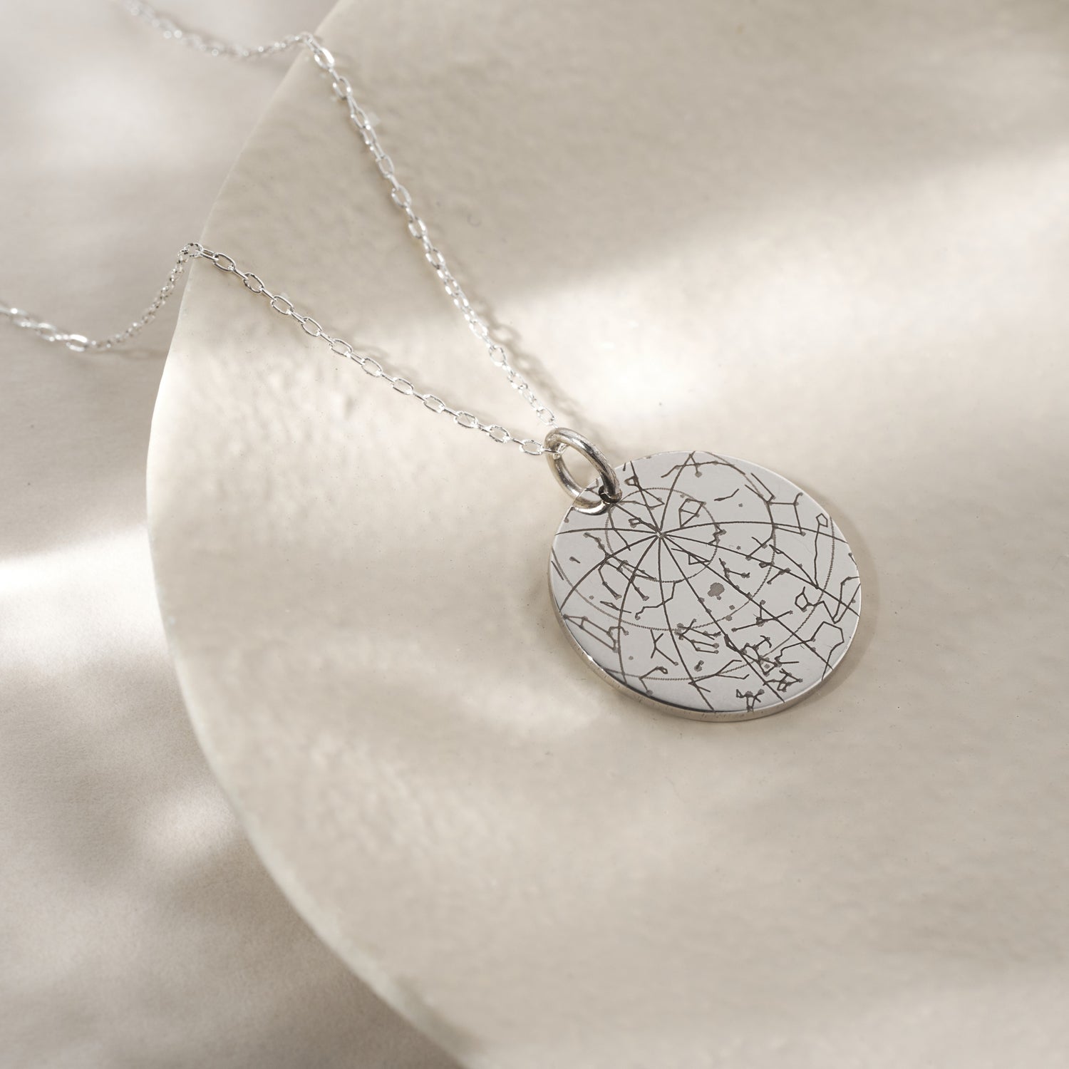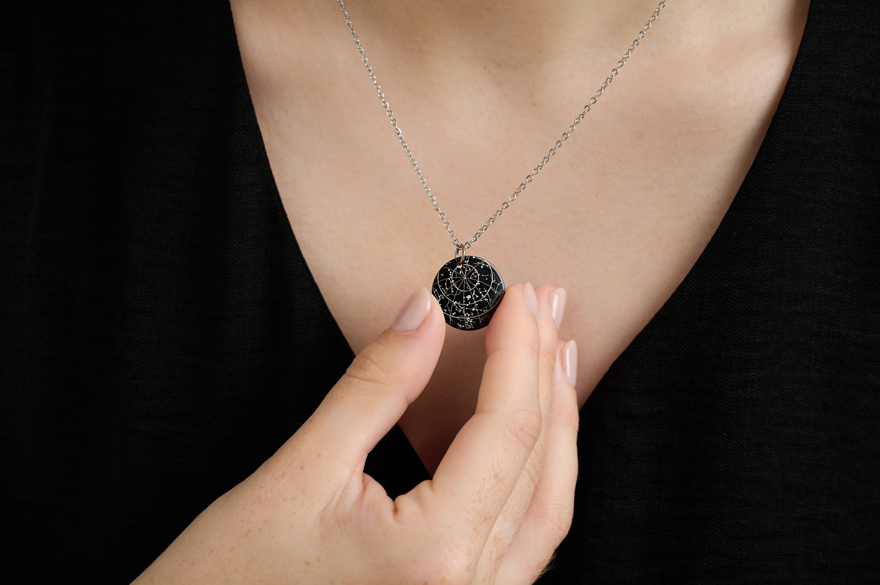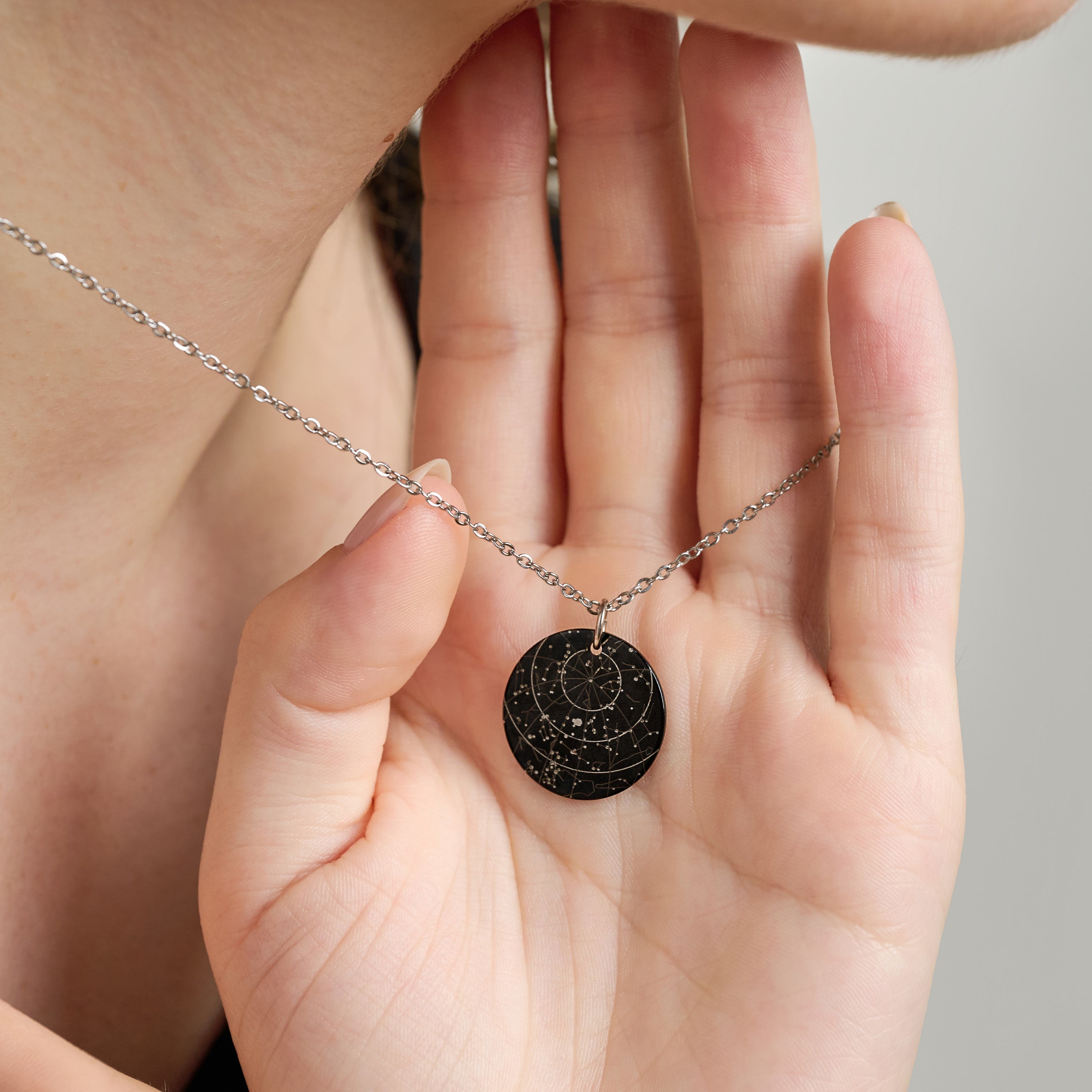 Each necklace is engraved with the exact night sky from your chosen date and place, created using astronomer-approved data with over 2 million stars.